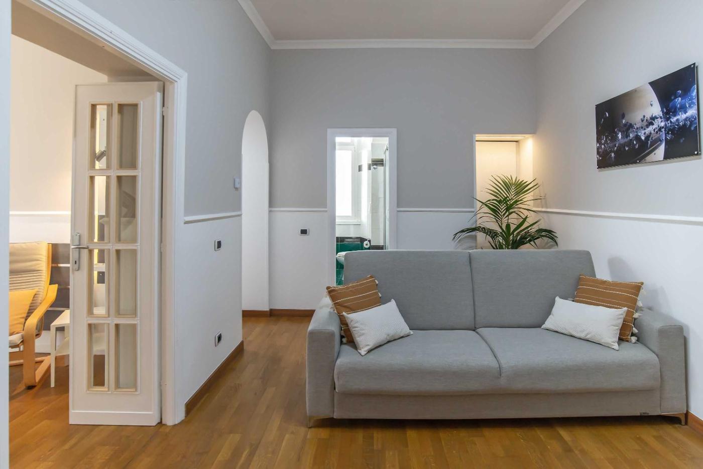 The apartment with a balcony and garden views features 1 bedroom, a living room, a flat-screen TV, an equipped kitchen with an oven and a microwave, and 1 bathroom with a bidet. Towels and bed linen are provided in the apartment. For added privacy, the accommodation features a private entrance.